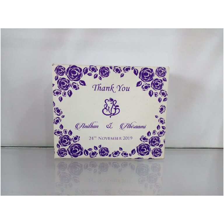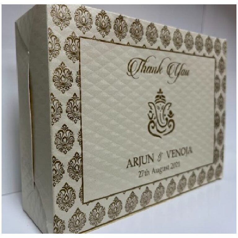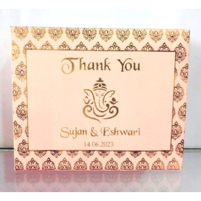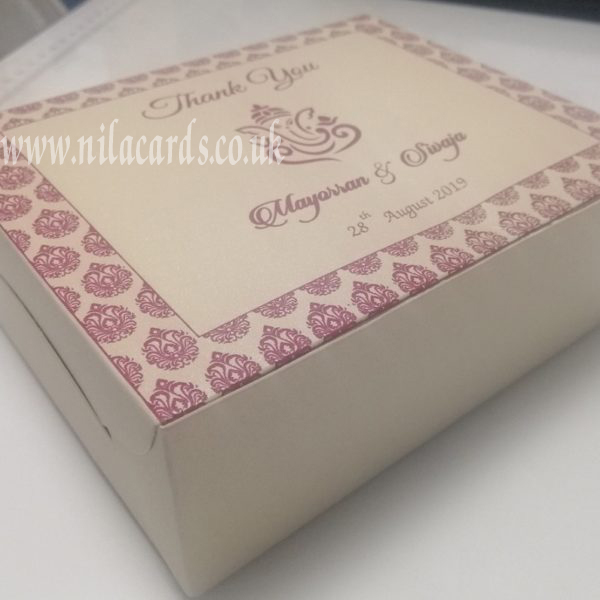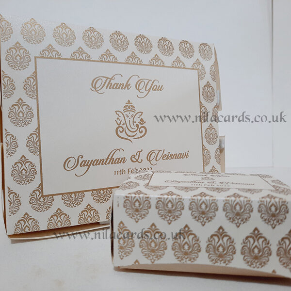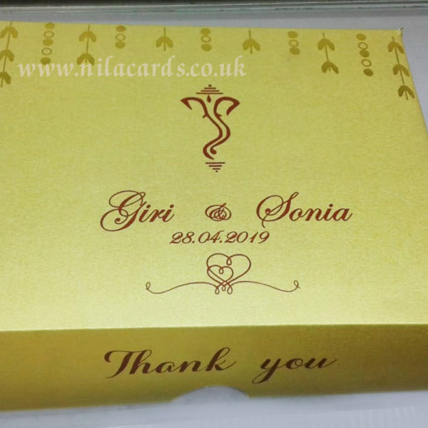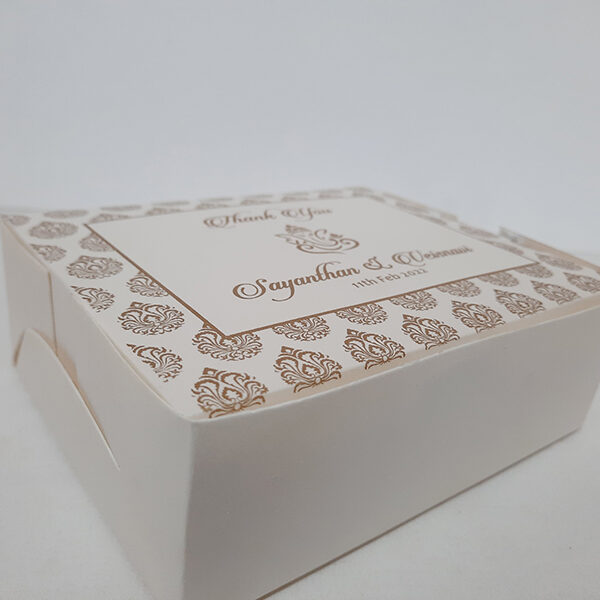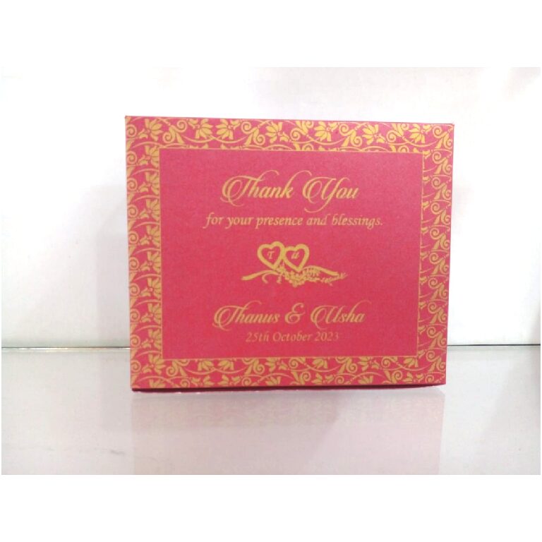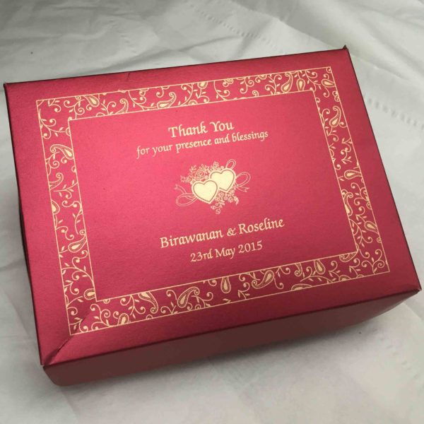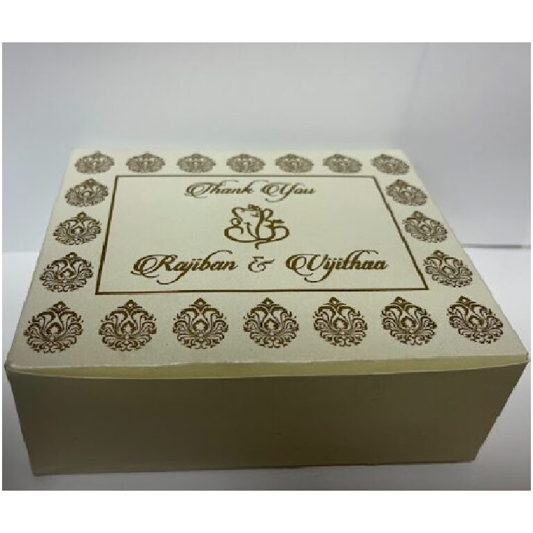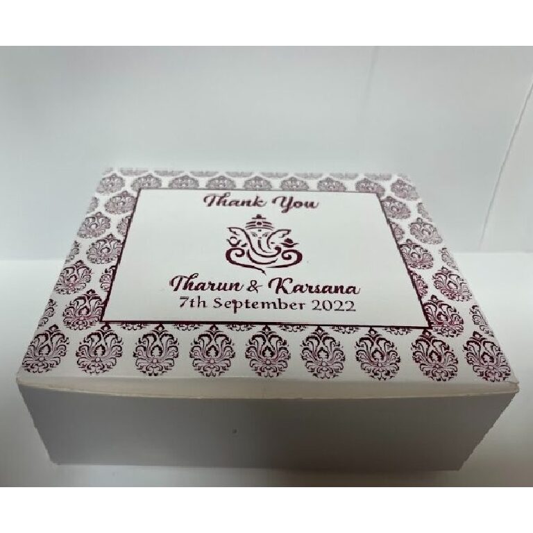 Snack boxes are one of the most popular stationery in Indian Wedding celebrations. Snack boxes are given initially with the sncks or breakfast or at the end of the ceremony. Nila cards produce customised mittai boxes as well to give along with the Indian wedding Invitations. We print customer names, logos and card designs to match the wedding Invitations. To match your wedding theme, we offer a wide variety of colour boards and ink options so each of your wedding stationary is matched and beautifully reflects your style and theme.