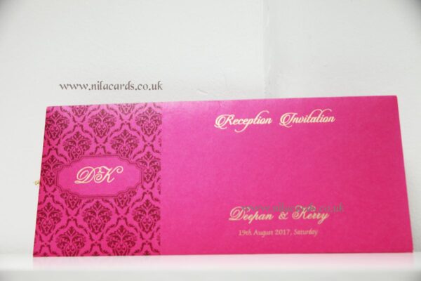 Attractive pink wedding invitation is one of our elegant designs. This invitation card is made out of pink textured paperboard with matching mailing envelope. Card front has a rich gold foiling with watermark design, couples names  Logo.  (Please note, this logo can be changed to any symbol or couple initial as per your preference). Please choose one of the colour from our colours pallet (please check the image) for envelopes. 120gsm shimmer paper. The card has two inserts with coordinated printed designs.