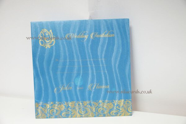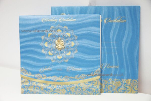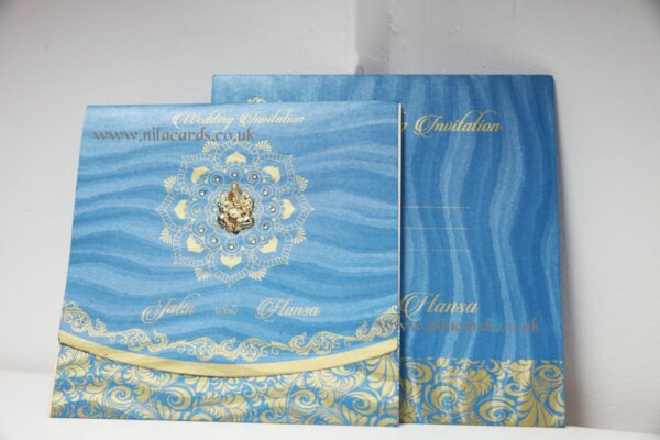 Attractive wide lotus wedding invitation is one of our elegant designs.This invitation card is made out of light blue textured metallic board with matching mailing envelope.Card front has a rich gold foil design and a 3D Ganesh logo(Please note,this logo can be changed to any symbol or couple initial as per your preference). Please choose one of the colour from our colours pallet (please check the image)for envelopes.120gsm shimmer paper.This card has two inserts with coordinated printing designs.