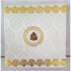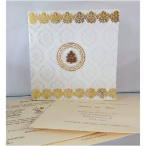 Border design gold foil white card wedding invitation is one of our elegant designs.This invitation card is made out of white textured paperboard with matching mailing envelope.Card front has a rich gold foiled design, water marks design and a foiled laser cut Ganesh logo(Please note, this logo can be changed to any symbol or couple initial as per your preference).Please choose one of the colour from our colours pallet(please check the image)for envelopes.120gsm shimmer paper.This card has two inserts with coordinated printed designs.