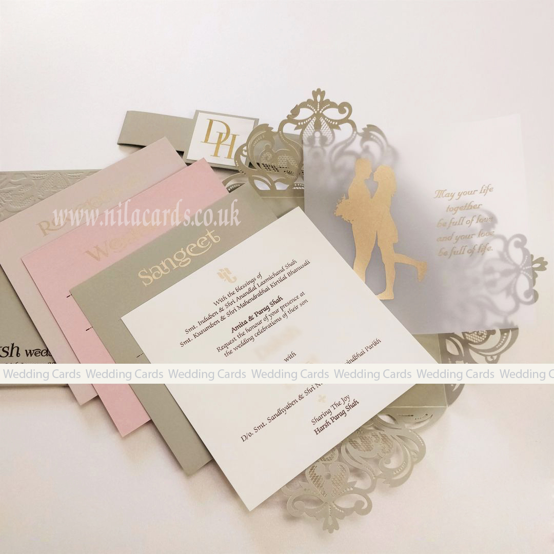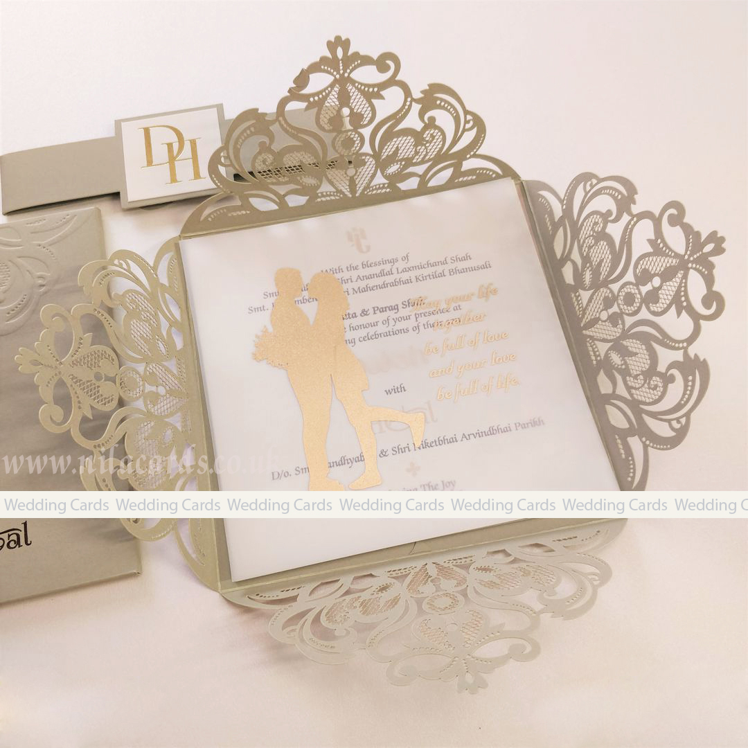 We have added an exciting new ranges of Laser cut cards for Hindu, Sikh, Muslim and Christian weddings. We also laser cut stickers as Ganpati, Radha Krishna, Ek Onkar, Allah, Bismillah Cross and many more which gives a added richness to your wedding invitations. All invitations are fully custom made. What you see on the website is an example of the work we can deliver to you.