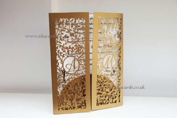 Center fold laser cut wedding invitation is one of our elegant designs. This invitation card is made out of gold textured paperboard with matching mailing envelope. Card front has a laser cut with  couples names  logo.  (Please note, this logo can be changed to any symbol or couple initial as per your preference). Please choose one of the colour from our colours pallet (please check the image) for envelopes. 120gsm shimmer paper. The card has two inserts with coordinated printed designs.