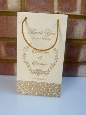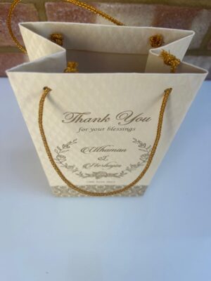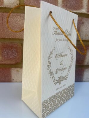 Cream with Gold colour Gift Bag is our unique product. We know the importance of your big day and our part in providing a grand opening to the event. Our invitations are stylish, uncommon, and eye-catching. It will satisfy your expectation and also earns appreciation from your family and friends.