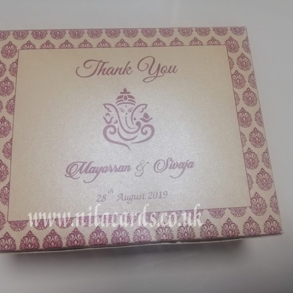 Damask design one piece snack box is one of the cutest that we produce.This cake box is made out of cream textured paperboard.cake box front has a Maroon ink screen print.