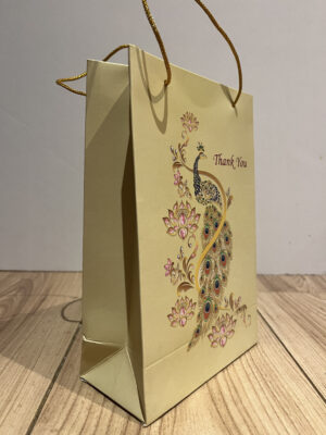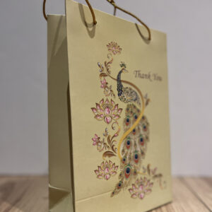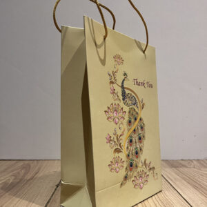 Digital peacock design bag –Digital peacock design bag is one of our beautiful design.These beautiful personalized gift bags are crafted out of very fine quality metallic card stock,with gold rope used as handles. Text and design printed on the bag is totally customizable.The printing on this bag is digital design.Hence the price reflects the luxury finishing.Minimum Order Quantity:100