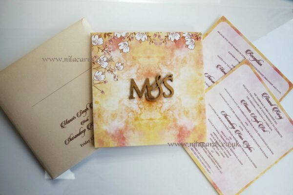 Some wedding cards are modern and elegant so that they suit all faiths. We use emblems, brocades and floral designs, also specially designed calligraphy initials uses on all the wedding stationery you order through us. We Differentiate the wedding ceremony, Sangeeth, Mehndi, Wedding, Ananad karaj, Waleema, and Reception with different symbols, and border formats so the guests can recognize the functions.