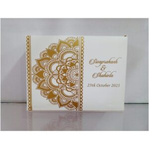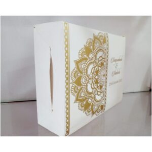 Gold flower Design Snack Box is our unique product. We know the importance of your big day and our part in providing a grand opening to the event. Our invitations are stylish, uncommon, and eye-catching. It will satisfy your expectation and also earns appreciation from your family and friends.
