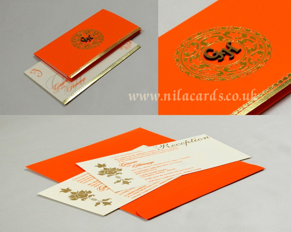 Nila Cards London is specialized in wedding invitations which is printed with religious or non religious symbols. Some wedding cards are modern and elegant so that they suit for all faiths. We use emblems, brocades and floral designs, also specially designed calligraphy initials to be used on all the wedding stationery you order through us. We Differentiate the wedding ceremony, Sangeeth, Mehndi, Wedding, Ananad karaj, Waleema and Reception with difference symbols, boarders formats so the gusts can clearly recognize the functions.