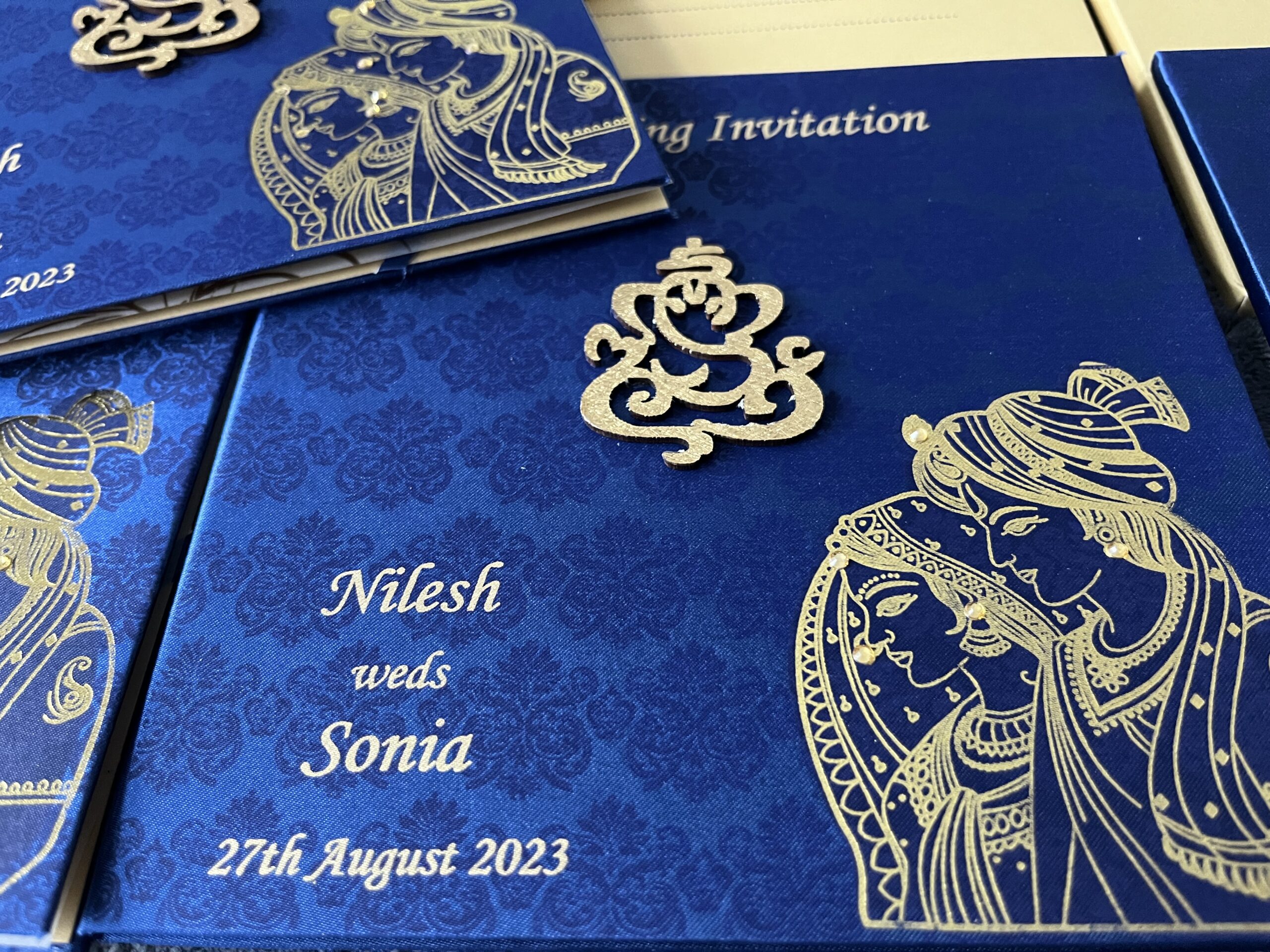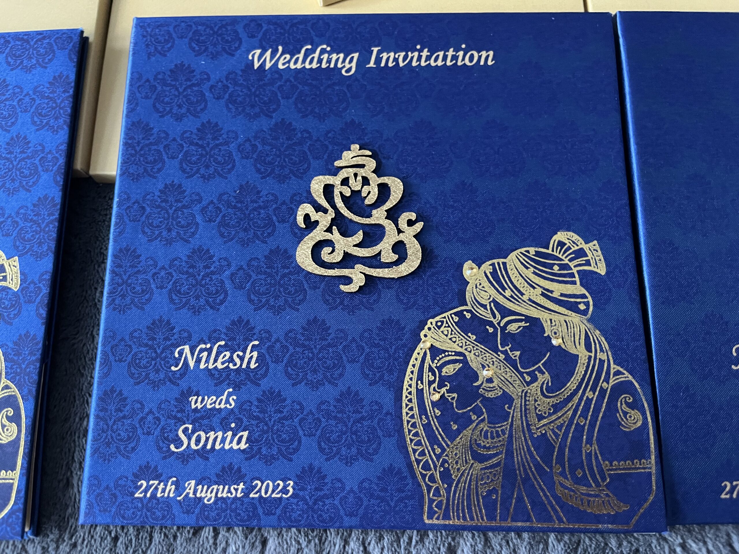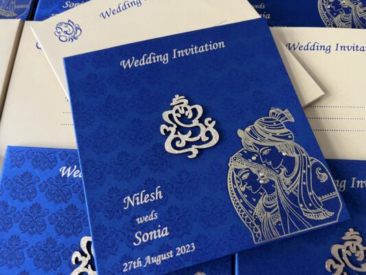 Gorgeous Blue Satin Wedding Invitation is one of our elegant designs. This invitation card is made out of Blue textured paperboard with matching mailing envelope. Card has damask water mark design printed on satin with foiled Rathe Krishna and a Ganesh laser cut logo (Please note, this logo can be changed to any symbol or couple initial as per your preference). Please choose one of the colours from our colour pallet (please check the image) for envelopes. 250gsm shimmer paper. The card has two inserts with coordinated printed designs.