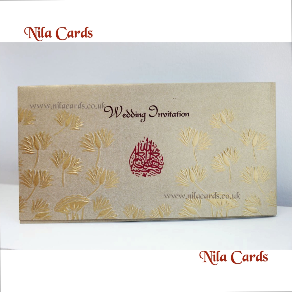 Islamic Symbol Wedding Invitation is one of our elegant design. This invitation card is made out of Gold textured paperboard with matching mailing envelope. Card front has a Lotus flower Embossed with  Gold ink  and Islamic logo in maroon ink (Please note, this logo can be changed to any symbol or couple initial as per your preference). Please choose one of the colours from our colour pallet (please check the image) for envelopes. 120gsm shimmer paper. The card has two inserts with coordinated printed design.