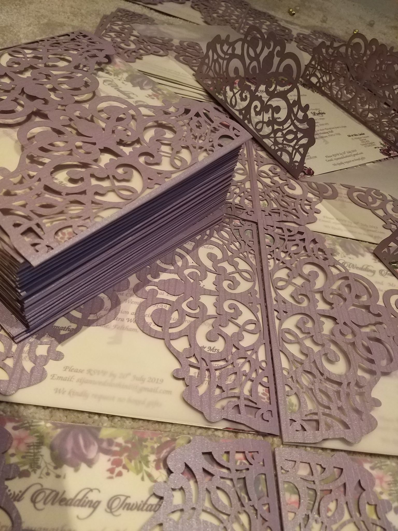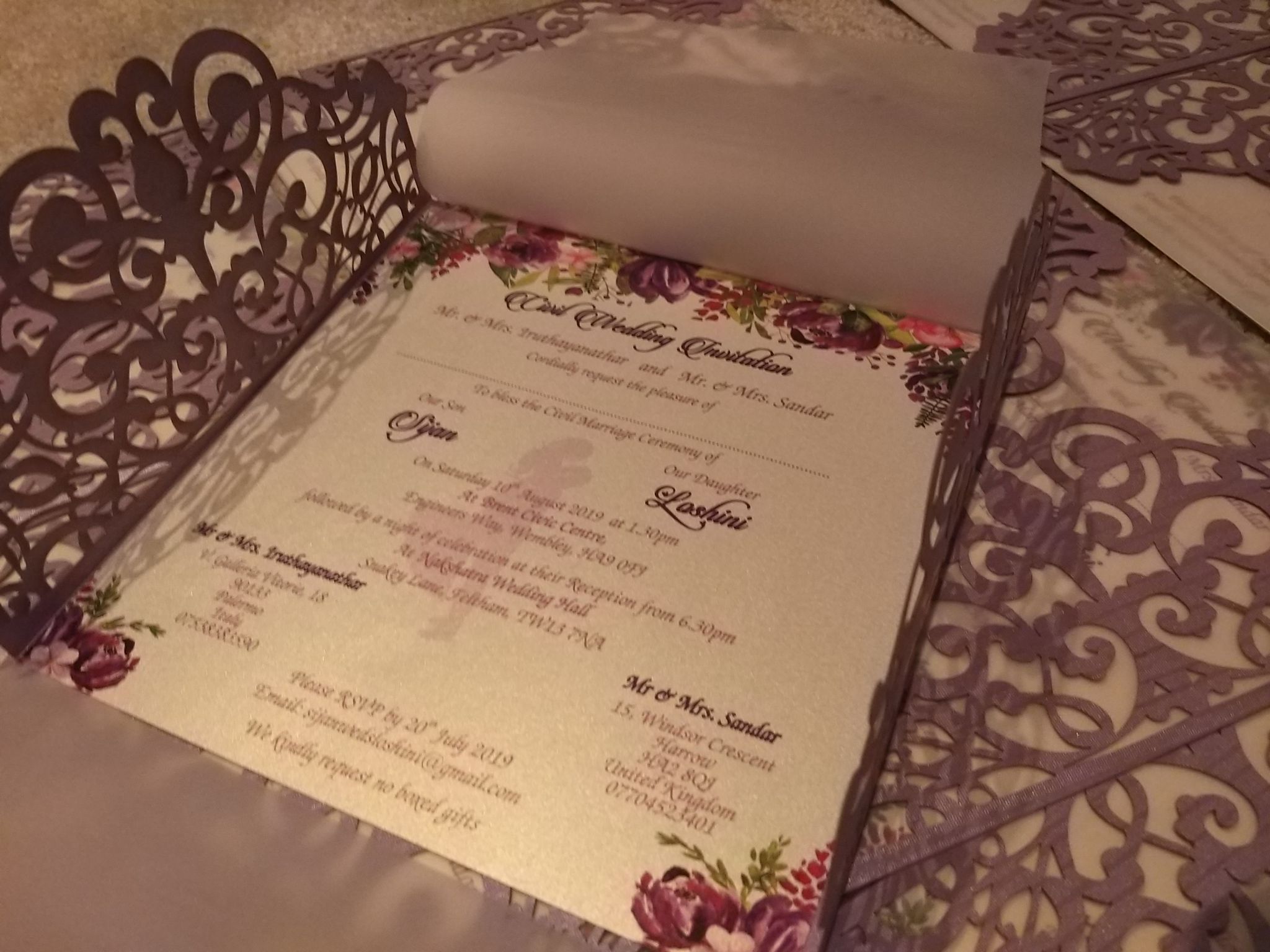 We have added an exciting new ranges of Laser cut cards for Hindu, Sikh, Muslim and Christian weddings. We also laser cut stickers as Ganpati, Radha Krishna, Ek Onkar, Allah, Bismillah Cross and many more which gives a added richness to your wedding invitations. All invitations are fully custom made. What you see on the website is an example of the work we can deliver to you.