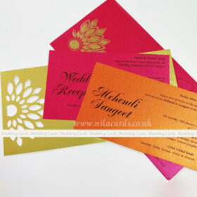 Nila Cards London is specialized in wedding invitations which is printed with religious or non religious symbols. Some wedding cards are modern and elegant so that they suit for all faiths. We use emblems, brocades and floral designs, also specially designed calligraphy initials to be used on all the wedding stationery you order through us. We Differentiate the wedding ceremony, Sangeeth, Mehndi, Wedding, Ananad karaj, Waleema and Reception with difference symbols, boarders formats so the gusts can clearly recognize the functions.
