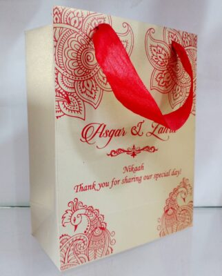 Personalized Mehndi Gift Bags – Gold and Red colour Gift Bag is our unique product. We know the importance of your big day and our part in providing a grand opening to the event. Our invitations are stylish, uncommon, and eye-catching. It will satisfy your expectation and also earns appreciation from your family and friends.