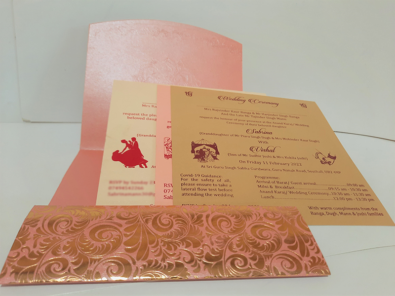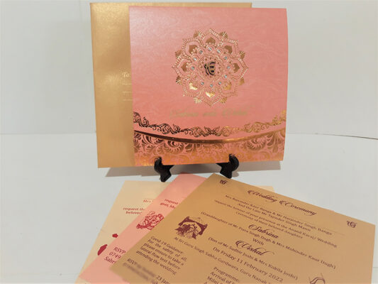 We continuously add new ranges of Invitations for Hindu, Sikh, Muslim, and all Asian weddings. We do have a collection of English invites with beautiful colors and selections as well. Our invitations are uncommon, They come in bright and mat colors according to your taste selection. We know that you look to build a theme for your wedding and uniformity in colors from start to end to match your outfits, stationeries, and hall decorations. All of the wedding invitations bespeak and can customize to suit your style and taste. Our invitations come with matching stationary such as inserts, RSVP cards, Mithai boxes, cake boxes, and wedding favor boxes. Also, we have bags, gift bags, Hindu Cards London, sweet boxes, wedding ceremony cards, place cards, table plans, and much more.