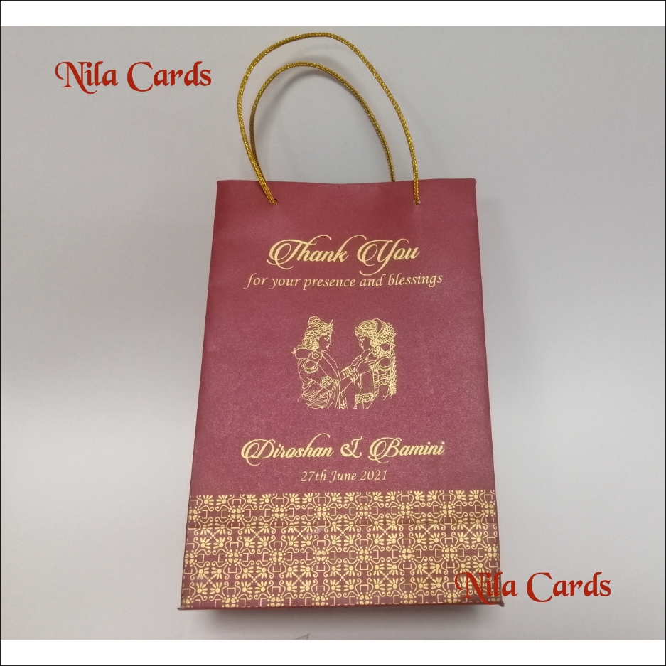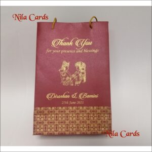 Wedding Gift Bag – BA004 – Medium. Maroon board and gold ink is one of our beautiful couple garland exchange design. This Thank you bag handle is a Gold colour rope.