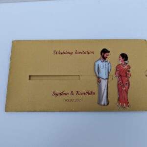 Gold sliding design invitation is one of our elegant designs.  This invitation card is made out of yellow textured metallic board with matching mailing envelope. Card front has laser cut couple photo and maroon screen printing.  (Please note, this logo can be changed to any symbol or couple initial as per your preference). Insert too have silk screen ground borders in different colours option.  Envelope is made out of ivory (cream). Please choose one of the colour from our colours pallet (please check the image) for envelopes.